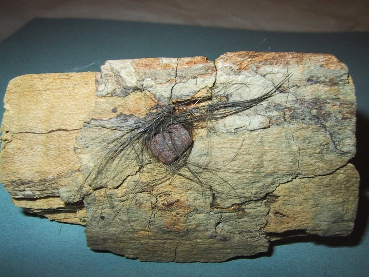 A piece of the Beaumont Tree with hair and nail embedded.